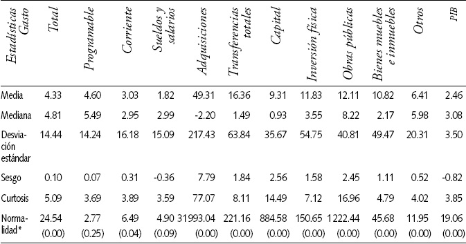 Como es bien sabido, la presencia de valores anómalos puede afectar las estimaciones econométricas.19 De hecho, su relevancia se observa en las estadísticas básicas de las series mostradas en el Cuadro 1, donde se aprecia que el gasto en adquisiciones se caracterizó por un alto crecimiento, pero también por una elevada volatilidad. Los valores anómalos se reflejan en una curtosis alta (que provoca que los valores se agrupen de forma muy pronunciada alrededor de la media) y en un sesgo positivo. Estas características, aunque con valores más pequeños, son compartidas por el gasto de transferencias, obras públicas, inversión física y bienes muebles e inmuebles. Para el resto de las variables, las estadísticas muestran menor crecimiento y volatilidad, aunque con similares distribuciones de frecuencias (el valor de la curtosis es mayor que 3 y siguen siendo sesgadas). Es decir, se tienen elevados valores positivos principalmente en el gasto total, programable, corriente, capital y otros. Por el contrario, existen grandes valores negativos en el rubro de sueldos y salarios. Por lo tanto, la mayoría de las variables, a excepción de los gastos programables y sueldos y salarios, presentan no normalidad, pues los valores p de la prueba de Jarque y Bera (1980), son menores de 0.05, lo que implica el rechazo de la hipótesis nula de normalidad. No obstante, se procedió a estimar los modelos econométricos, dejando su corrección para una etapa posterior.