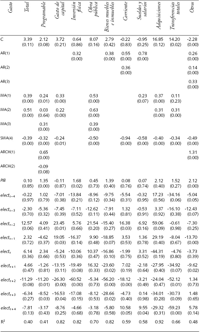 Como se observa en el cuadro, los renglones de gasto total, gasto de capital y gasto corriente muestran evidencia completa de CPP en el sentido de que se estima un incremento antes y una reducción después en sus tasas de crecimiento durante algunos de los periodos que circundan las elecciones.22 Los resultados sobre el gasto total son congruentes con lo detectado en los estudios de Gámez e Ibarra (2009) y Ramírez y Erquizio (2012), quienes analizan el gasto de los estados, y de Magaloni (2000), quien hace lo propio con el gasto público total.