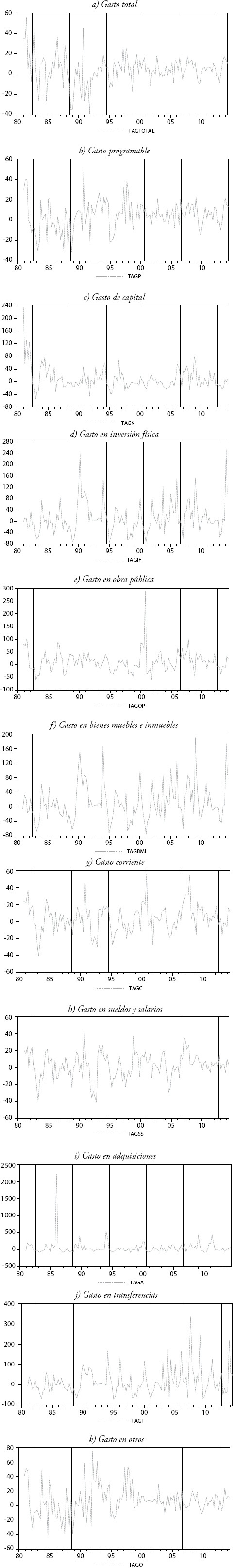 Los paneles de la la Gráfica 1 muestra las tasas anualizadas de crecimiento de cada uno de los componentes del gasto público. A simple vista destacan dos características importantes que condicionarán su modelaje. Primero, en términos generales, las series no presentan tendencia y parecen ser estacionarias en media, lo que se confirma con la aplicación de las pruebas de raíz unitaria de Dickey y Fuller (1981) en su versión aumentada, dfa, y de Phillips y Perron (1988), pp. Los estadísticos de prueba que se presentan en el Anexo 2, estimados en modelos que incluyen intercepto y el número requerido de rezagos para eliminar la autocorrelación de los residuos, permiten rechazar la hipótesis nula de no estacionariedad en todos los casos al uno por ciento de significancia. Segundo, las series presentan una elevada volatilidad además de varias observaciones anómalas18 asociadas principalmente a incrementos sustanciales en diferentes rubros del gasto público, lo cual podría explicarse por el manejo altamente discrecional del mismo, aun cuando existan restricciones en su manejo.
