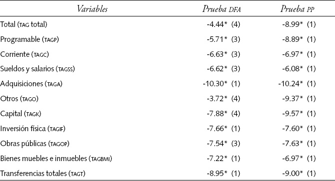 Fuente: Elaboración propia; las estimaciones se hicieron en Eviews 8.0. *Significativo al 1 por ciento. Las pruebas incluyen sólo intercepto. Los números entre paréntesis indican el número de rezagos y el parámetro de truncación empleados en las pruebas DFA y PP, respectivamente.