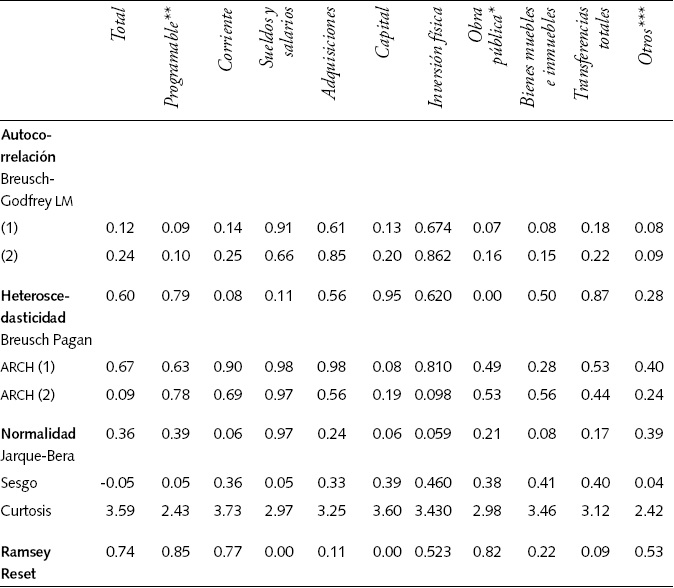 Para verificar que la especificación de los modelos es adecuada se evaluaron los supuestos de normalidad, homoscedasticidad, no autocorrelación y correcta especificación de los residuos; los resultados se presentan en el Anexo 3, donde se observa que, en general, los modelos cumplen con tales supuestos al 5 por ciento de significancia.20 Es importante mencionar que se incluyeron variables dicótomas para eliminar los efectos de las observaciones anómalas a las que se ha hecho alusión, lo cual permitió erradicar la no normalidad.