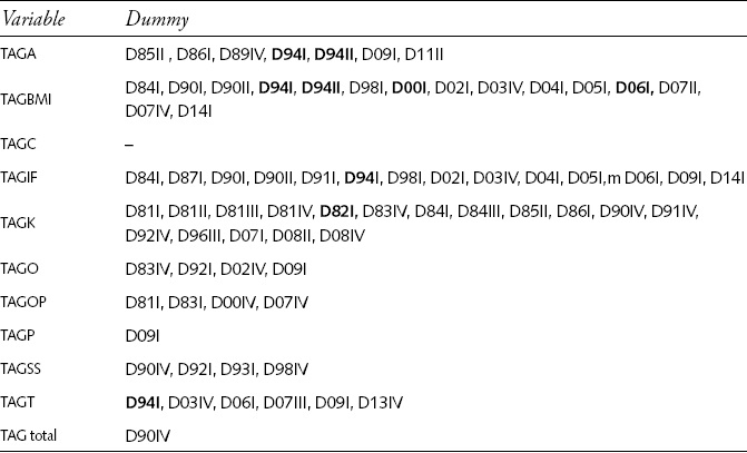 Fuente: Elaboración propia. Las variables dicótomas están denotadas por una D seguida del año en el cual está el valor extremo y posteriormente con números romanos se indica el trimestre. Las fechas en negritas se pueden asociar al calendario electoral.