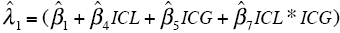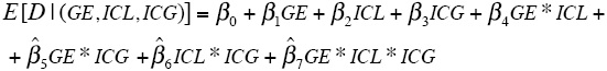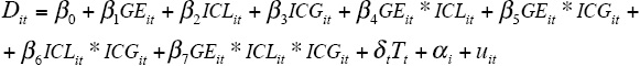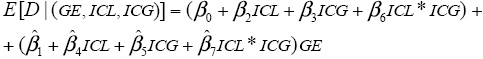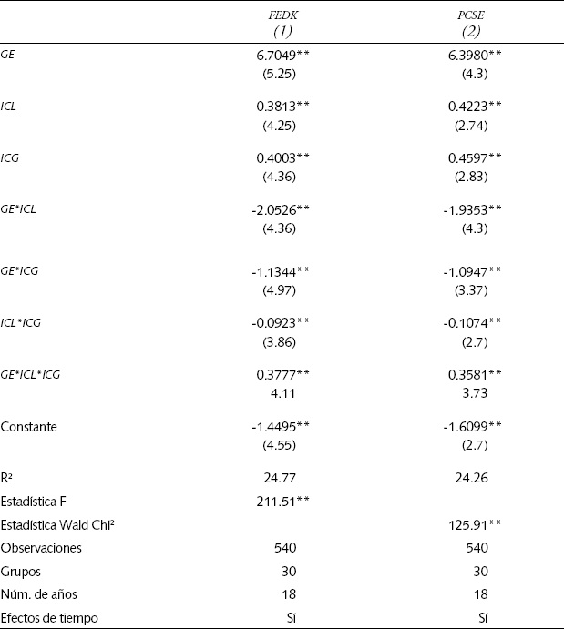 El método de pendientes simples para evaluar (probe) relaciones interactivas, consiste en presentar gráficamente y corroborar estadísticamente si el efecto de la variable independiente focal es estadísticamente significativo a diferentes valores de las variables moderadoras (Bauer y Curran, 2005). Siguiendo a Preacher et al. (2006), el modelo en la ecuación (2) puede definirse como una ecuación predicativa simplificada (4) para enfatizar que el valor esperado de la diferencia en el gasto estatal real por persona depende de los valores de la variable independiente focal (GE) y las variables moderadoras ICL y ICG: