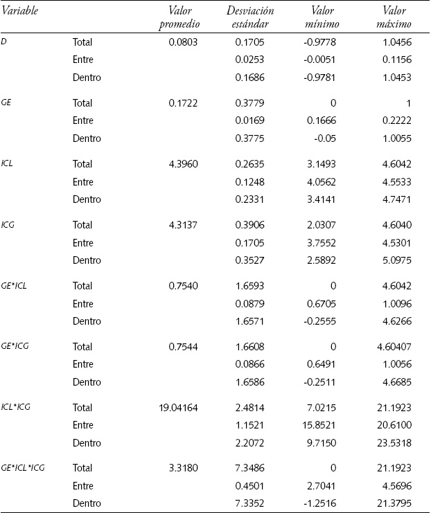 donde el subíndice i se refiere a cada estado, el subíndice t a los años de la muestra, D representa la diferencia del logaritmo natural del gasto real por persona de los gobiernos estatales, ge es la variable categórica con valor de uno en los años que se realiza la elección de gobernador y cero en otros años, ICL es el logaritmo natural del índice de competencia en la elección de diputados locales, ICG es el logaritmo natural del índice de competencia en la elección de gobernador, GE*ICL, GE*ICG, ICL*ICG y GE*ICL*ICG son variables interactivas, t representa variables categóricas para controlar por los efectos de tiempo, α son los efectos específicos individuales de los estados y u es el termino de error.7 Las variables interactivas, las cuales son el foco de este estudio, implican que la magnitud de la relación entre la variable dependiente (D) y la variable independiente central (GE) depende de la función de otras variables independientes (ICL y ICG) que modera dicha relación. El Cuadro 1 presenta las estadísticas descriptivas de las variables utilizadas.