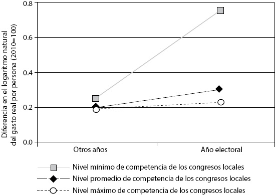 = 0.0389, error estándar = 0.0315, t = 1.2362, p = 0.2169). Es decir, el aumento del gasto real por persona en los estados en años electorales (el ciclo político oportunista), es una función inversa al nivel de competencia en las elecciones para diputados locales y no es estadísticamente significativo cuando existe un alto grado de competencia electoral en los congresos locales.15