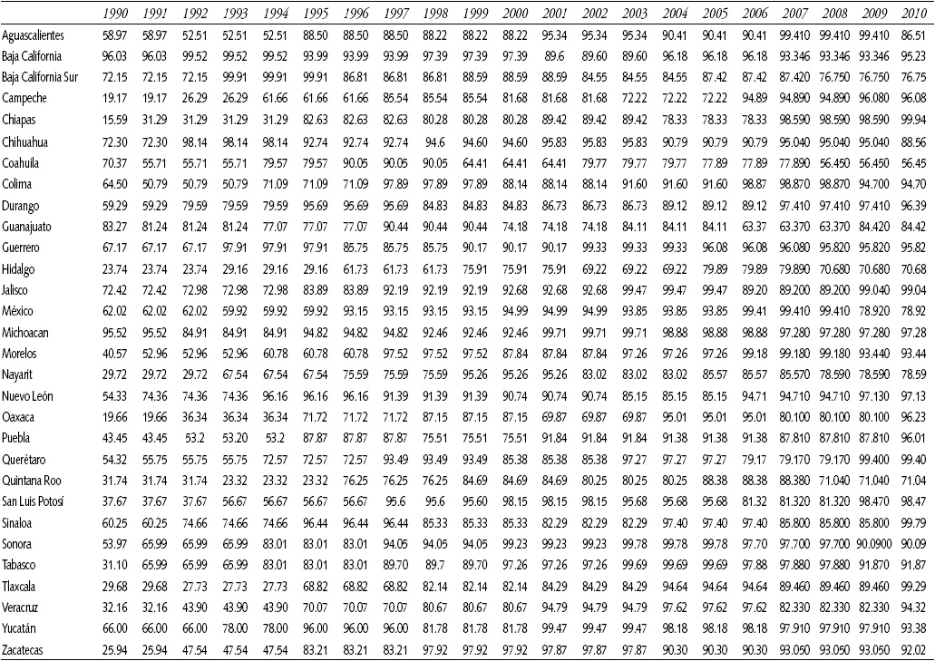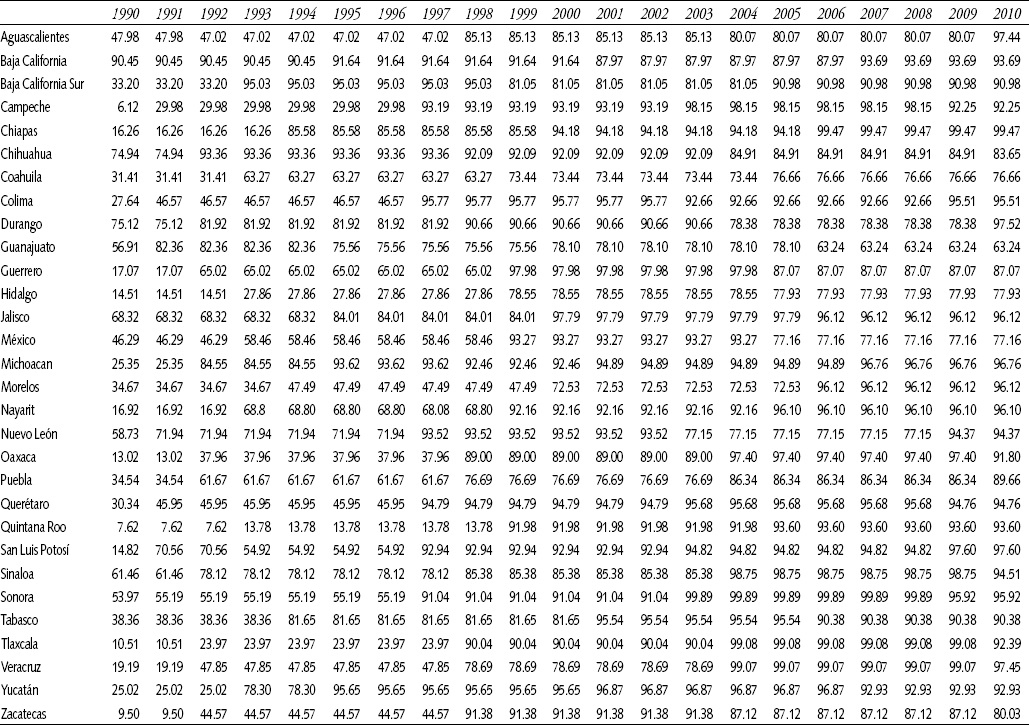Las variables de competencia política se calcularon de acuerdo con los resultados oficiales de las elecciones para gobernador y las elecciones de diputados locales de mayoría relativa recopilados por el Centro de Estudios de la Democracia y Elecciones (CEDE) de la Universidad Autónoma de México (UAM) y se complementaron con datos de los distintos institutos electorales estatales. Como medida de competencia se utilizó el índice de margen de victoria (MV ) calculado como la diferencia entre el porcentaje de votos conseguido por el partido ganador de la elección (S1) y el partido que obtuvo el segundo lugar (S2).5