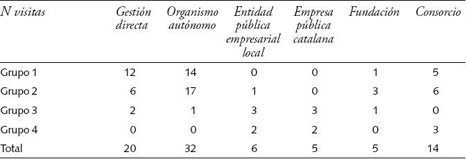 Por volumen de visitas, de los museos gestionados mediante una entidad pública empresarial local, el grupo predominante es el tercero y, por primera vez, aparecen algunos museos encuadrados en el cuarto grupo, como el Museo Picasso de Barcelona (este museo en el momento de realizar el trabajo de campo se gestionaba mediante esta personificación instrumental, pero posteriormente ha pasado a ser gestionado mediante una fundación) (Cuadro 3). El grupo tercero, predominante en los museos regidos por una entidad pública empresarial local, era prácticamente inexistente entre los museos gestionados directamente (en los cuales predominaba el grupo uno) o mediante organismos autónomos (en los cuales predominaba el grupo dos). A tenor de estos resultados parece confirmarse que a medida que aumentan los volúmenes de gestión la autonomización adopta fórmulas cada vez más próximas al derecho privado.