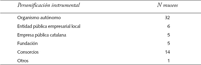 En los restantes 63 museos públicos catalanes no existe una plena identificación entre la titularidad y el ente de gestión. Este hecho es consecuencia de la concesión de ciertos grados de autonomía de gestión en relación a su institución titular. Como veremos a continuación, la concesión de esta autonomía se ha concretado a través de la utilización de diversas personificaciones instrumentales para la gestión de los museos públicos catalanes.