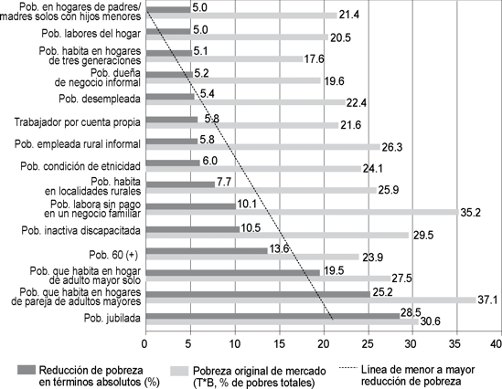 Como puede apreciarse en la parte baja de la gráfica 1, los últimos cuatro grupos representan personas de la tercera edad. Sea como jubilados, como población que habita en hogares de adultos mayores, o como población mayor de 60 años. Por eso puede afirmarse con seguridad que este grupo social es el que ha gozado de prioridad en términos de la reducción de su pobreza por ingresos. Entre las prioridades también se encuentran los inactivos discapacitados, población que labora en el mercado informal (población que labora sin pago, empleados rurales informales, trabajadores por cuenta propia, dueños de negocios informales), población que habita en áreas rurales, población con condición de etnicidad, población desempleada, población que se dedica a labores del hogar, población que habita en hogares de tres generaciones y hogares monoparentales. La mayor reducción por grupo social, como resultado de las transferencias presupuestales, es del orden de 28.5 por ciento de pobres totales para la población jubilada, pero el promedio de reducción para todos los grupos sociales es de 3.9 por ciento de pobres totales, lo cual puede considerarse sumamente bajo.