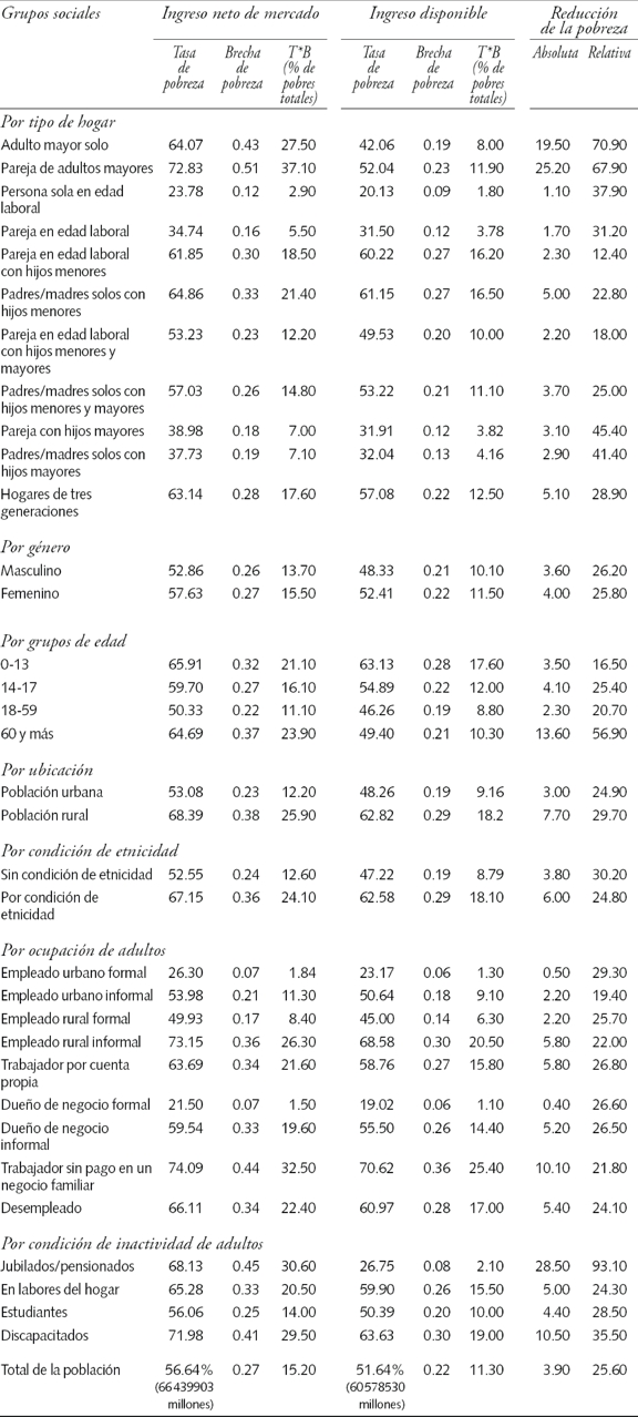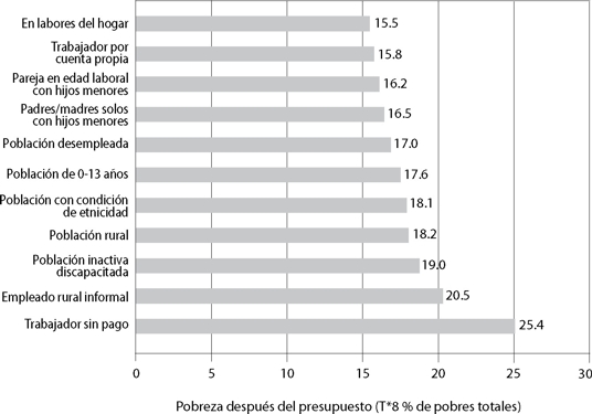 El resto de los grupos más pobres (inactivos discapacitados, población que labora en el mercado informal, población que habita en áreas rurales, población con condición de etnicidad, población desempleada, población que se dedica a labores del hogar), a pesar de que son los que más disminuyen su pobreza, respecto a otras categorías en cada variable, lo hacen en una proporción muy pequeña, por lo que, de todos modos, terminan siendo los grupos más pobres de acuerdo con el ingreso disponible. Esto implica que las compensaciones de los programas que transfieren recursos directos son tan pequeñas, que el ingreso original de mercado se constituye en el principal determinante de las condiciones de pobreza de los grupos sociales.