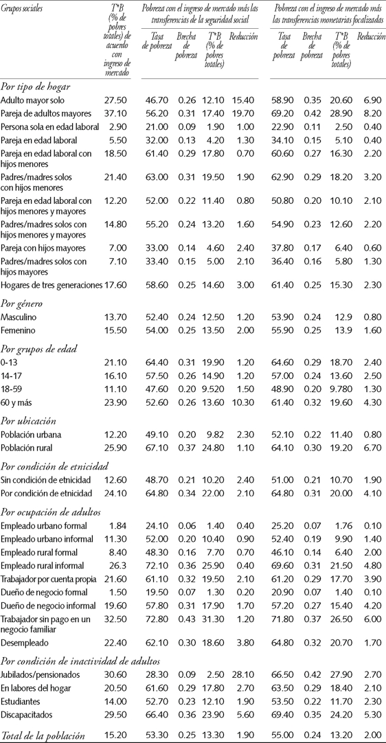 Cuando se analiza la efectividad de las políticas de transferencias monetarias por grupos sociales, se encuentra que los grupos más pobres de acuerdo con su ingreso neto de mercado son adultos mayores, niños, inactivos discapacitados, población que labora en el mercado informal, población que habita en áreas rurales, población con condición de etnicidad, población desempleada y población que se dedica a labores del hogar. En general, estos son los grupos que más bajan su pobreza por el efecto de las transferencias gubernamentales, con la excepción de los niños (0-13). Tanto su grupo de edad, como los hogares en que viven menores, son los que menos pobreza reducen en términos relativos dentro de cada variable en cuestión. En consecuencia, a pesar de que los discursos de ciertos programas sociales como Oportunidades “pretendan” demostrar lo contrario, los niños constituyen el grupo más desatendido en términos de prioridades de política para disminuir la pobreza monetaria en México.