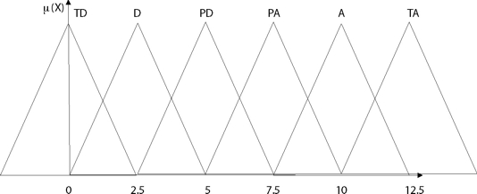 Los datos se analizaron utilizando un análisis matemático difuso, en el que a la escala lingüística se le asoció un número difuso triangular. La gráfica 1 ilustra la función de pertenencia.