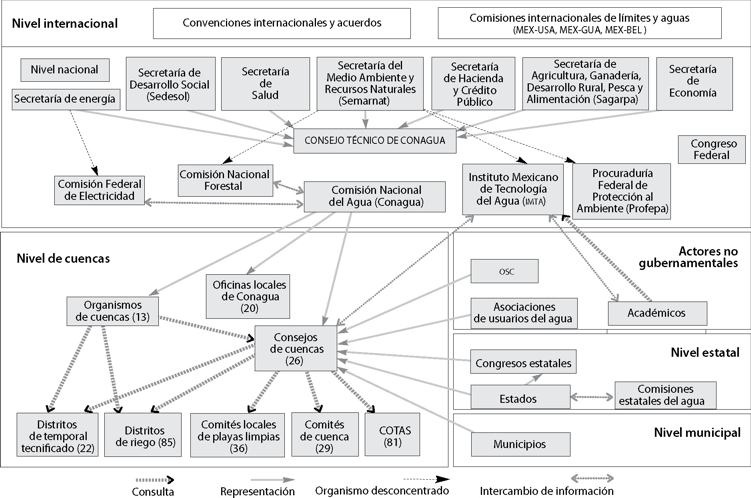 De acuerdo con Sandoval (2002), en la mayoría de los casos el número de actores involucrados es muy alto, lo que provoca rigidez en los procesos de planeación, asimismo, no hay delimitación clara de objetivos, funciones y tareas de cada organismo y actor. Como se observa en el diagrama 1, existen numerosos actores involucrados en la planeación del agua: instituciones públicas, actores del ámbito económico (empresas, comercio entre otros), actores socioculturales, actores académicos, actores políticos y actores internacionales.