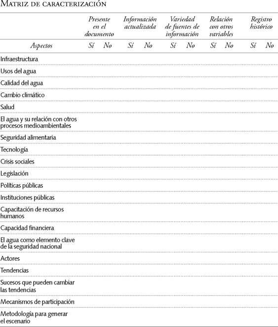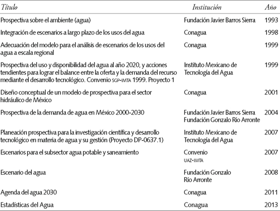 Se obtuvo acceso y se recopiló una muestra de once escenarios que se presentan aquí, de las principales instituciones que de alguna manera han estado vinculadas con la planeación prospectiva del agua: la Comisión Nacional del Agua (Conagua), la fundación Gonzalo Río Arronte y el Instituto Mexicano de Tecnología del Agua (IMTA). Se detectaron los documentos mediante una búsqueda en los centros de información de las instituciones y por medio de la colaboración de funcionarios de la Conagua (cuadro 4).