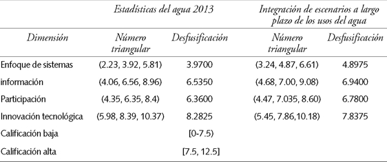 Como se observa en el cuadro anterior, las desfusificaciones varían en el rango de [3.978.28], lo que quiere decir que las dimensiones son calificadas con una puntuación baja. En lo que respecta a la dimensión de innovación tecnológica, el resultado demuestra una puntuación alta, pero cabe mencionar que aproximadamente 32 por ciento de los expertos consultados desconoce en su totalidad los procesos internos de la Conagua, principalmente en lo que respecta a los mecanismos de difusión e implementación de los escenarios; por eso la puntuación otorgada a esta dimensión es relativamente alta.