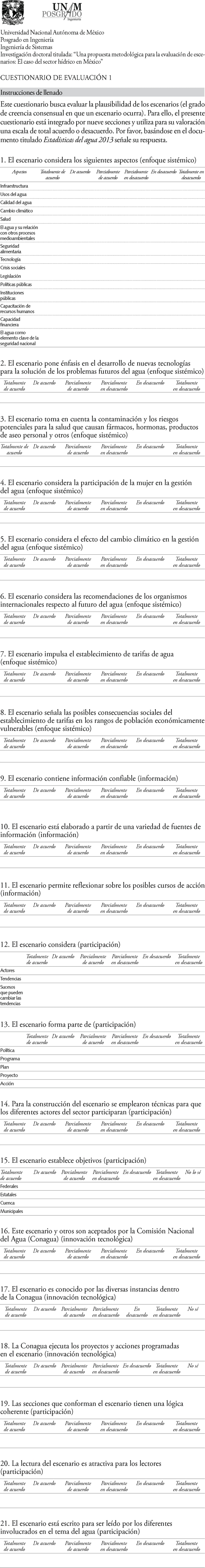 La validación de los instrumentos se realizó participativamente y se utilizaron los índices de Aiken (1985) y Lawsche (1975). Los expertos considerados en este proceso de validación fueron los siguientes: a) investigador en Ciencias Políticas y temática del agua, b) especialista e investigador en el área de tratamiento de aguas residuales, c) especialista en planeación del agua, d) dos especialistas en planeación, e) experto internacional en materia de prospectiva, f) experto nacional en materia de prospectiva, g) experto en economía del agua.