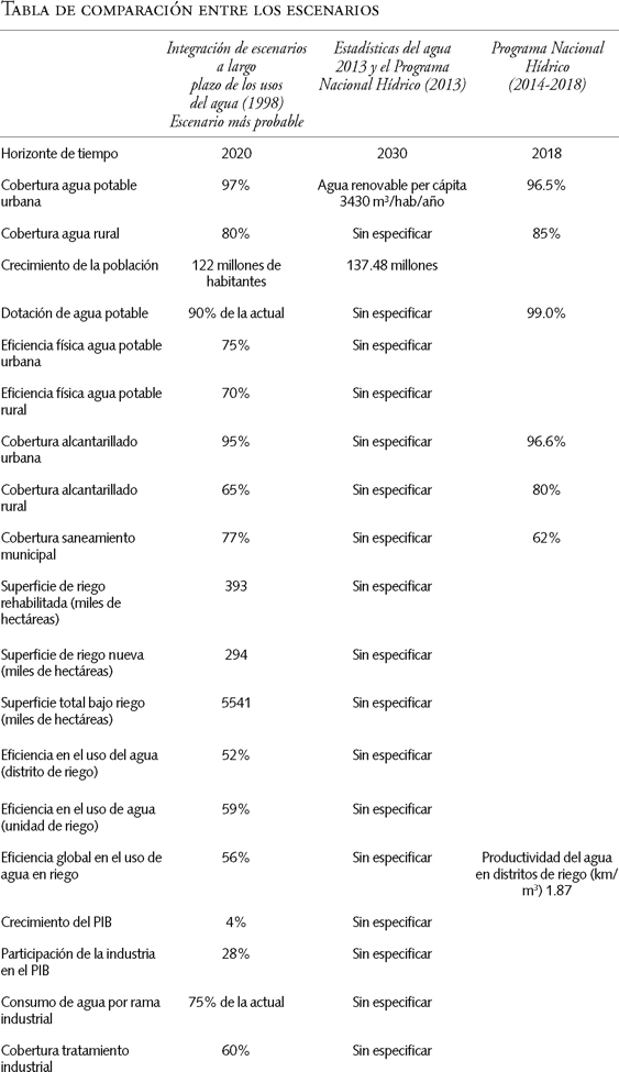 Las metas consideradas por el PNH (2014-2018) son mayores que las visualizadas por el escenario más probable del documento Integración de escenarios a largo plazo de los usos del agua (horizonte de tiempo 2020), aunque los horizontes de planeación son distintos.