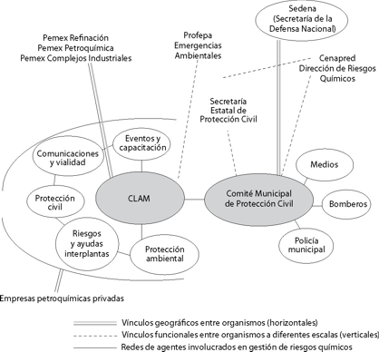 Este artículo explora tres aspectos en los que estos agentes articulan sus acciones en torno a la RRD tecnológicos: los acuerdos institucionales y formas de gobernanza en torno al riesgo (Kooiman, 2003); el problema de la jurisdicción entre agentes diferentes (Ford, 1999), y el papel de la confianza organizacional en la colaboración (Creed y Miles, 1996). Nos enfocamos en el sistema de gestión de emergencias químicas en Coatzacoalcos, México, una región en la que se localizan varias plantas petroquímicas importantes de Pemex, junto con un conjunto de subcontratistas privados y empresas asociadas. Geográficamente, cubre el municipio de Coatzacoalcos; los complejos petroquímicos de Cangrejera, Pajaritos y Morelos, y un conjunto de 28 empresas, incluyendo varias ramas de Pemex, la Comisión Federal de Electricidad y otras veinte compañías energéticas privadas. Tales complejos petroquímicos han surgido como resultado de la interdependencia de distintas ramas químicas en los insumos que pueden proveerse mutuamente, cuyo resultado espacial han sido conjuntos de empresas concatenadas que no sólo colaboran, sino que también compiten entre sí.7 Analizamos los vínculos, alcance y escalas de interacción entre varias organizaciones involucradas en el proceso de gobernanza de riesgos ambientales-tecnológicos en una sección de este conjunto petroquímico; este caso ilustra algunos componentes de la construcción política del riesgo y los vínculos entre agencia y geografía, una cuestión de los problemas emergentes del ordenamiento territorial.