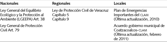El CLAM de Coatzacoalcos nació por iniciativa de las empresas localizadas en la zona del sur de Veracruz.11 Entre 1968 y 1985, los representantes de las empresas organizaron una estrategia informal de apoyo: llevaron a cabo entrenamiento básico para emergencias para cada técnico responsable. La asociación se registró en 1985 bajo la figura de asociación civil, y su propósito es apoyar mutuamente las acciones preventivas y reactivas en caso de una emergencia química en sus áreas de actividad.12 La figura formal de la asociación civil es común en muchas de esas organizaciones, pues hay pocos elementos en el marco legal ambiental o de protección civil de México que las regulen. La Ley General del Equilibrio Ecológico y la Protección al Ambiente (LGEEPA),13 la Ley General de Protección Civil (LGPC)14 y otras leyes locales (distintas en cada estado) tienen elementos que estas organizaciones han usado como lineamientos para sus acciones y alcance. Sin embargo, a pesar de la fragmentación y dispersión de tales instrumentos jurídicos, estas organizaciones actualmente tienen una posición muy clara dentro del Sistema Nacional de Protección Civil (Sinaproc) y están reconocidas como socios legales posibles para los comités municipales de protección civil en las zonas en las que están localizadas, una vez que las autoridades locales las registren como “terceras partes acreditadas”.15 Los instrumentos legales que establecen la necesidad de organizaciones locales de apoyo mutuo se muestran en el cuadro 1.