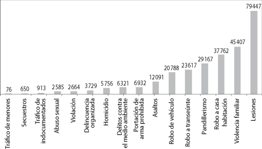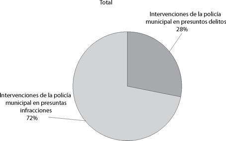 Una muestra de ello es que, del total de las intervenciones que registran anualmente las policías municipales en México, 72 por ciento tiene como fundamento el ámbito regulatorio de policía y buen gobierno (presuntas infracciones), y sólo el restante 28 por ciento se refiere a presuntos hechos delictivos, de los cuales en 94 por ciento de los casos se trata de delitos del orden local (INEGI, 2010) (gráfica 1).