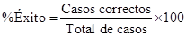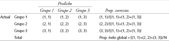 Aquí, (1, 1) representa el número de casos que perteneciendo al grupo 1 resultaron ser asignados por el modelo de uno modo correcto al grupo 1. Por otro lado, (1, 2) representa el número de casos que perteneciendo al grupo 1, resultaron ser erróneamente asignados por el modelo al grupo 2. Y así sucesivamente. El éxito en la predicción para el grupo 1 es la proporción de predicciones correctas para el grupo 1, es decir la razón entre (1, 1) y el total de elementos del grupo 1, que equivale a la suma de los elementos de la fila correspondiente al grupo 1. Repitiendo este procedimiento para todos los grupos, el éxito global del modelo se mide por la suma de los elementos de la diagonal de la matriz, dividido entre el total de casos, es decir: