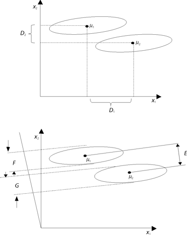 Para ilustrar la técnica en el caso de sólo dos grupos, considérese la gráfica 3 (arriba) donde se muestran dos grupos cuyos elementos-puntos aparecen en dos óvalos, respectivamente. El objetivo es encontrar la forma de visualizar ambos grupos de la forma más clara posible, evitando traslapamientos de los grupos, si es posible. Si los grupos son vistos desde abajo (es decir desde el eje X1), o lateralmente (es decir desde el eje X2) existe traslapamiento de los óvalos. Además, las distancias entre las medias ya no son máximas, las que corresponden a D1 y D2 respectivamente.