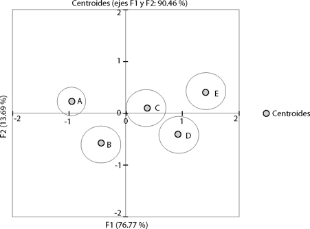La gráfica 4 muestra los centroides y círculos de confianza para el Modelo 1. Esta representación gráfica permite apreciar que después de la rotación descrita por la gráfica 3 (véase apartado metodológico), el eje F1 (horizontal) por sí solo captura prácticamente 76.77 por ciento de la dispersión/información total de las variables. Sin embargo, con dos funciones (F1 y F2) en conjunto se captura 90.46 por ciento. Luego, con solamente estas dos funciones los cinco grupos son claramente diferenciados a través del AD, sin que exista traslapamiento en los intervalos de confianza, aunque los grupos C y D aparecen bastante cercanos.