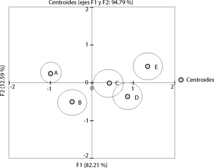 Nótese también que los cinco grupos aparecen en la secuencia esperada si son vistos en el eje F1, es decir, el grupo 1 aparece a la extrema izquierda y los restantes grupos aparecen en una secuencia ordenada hacia la derecha. Además, el grupo 1 es estimado con una buena precisión relativa, debido a que su círculo de confianza es más pequeño.