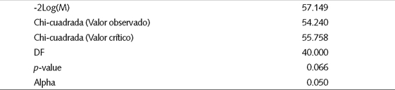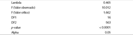 El test de Wilks para la igualdad de medias de las funciones tiene por hipótesis nula que la media de los cinco vectores (grupos) son iguales. Los datos del cuadro 9 muestran un p-value muy pequeño, y la hipótesis debe ser rechazada, implicando que los grupos están estadísticamente separados unos de otros. Resumiendo, ambas pruebas permiten concluir que el modelo discriminante puede ser aplicado exitosamente usando solamente cuatro variables explicativas.