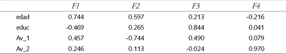 El cuadro 6 muestra los coeficientes estandarizados de las funciones discriminantes canónicas (el Modelo 1 requiere sólo cuatro funciones discriminantes). Por tratarse de coeficientes estandarizados, aquellas variables que reportan mayores coeficientes en valores absolutos tienen una mayor importancia o peso relativo en la clasificación. En este sentido, las variables edad, educ, Av_1 y Av_2 parecen permitir construir un modelo simplificado, excluyendo las demás variables. Esto se analiza más adelante, en el Modelo 2.