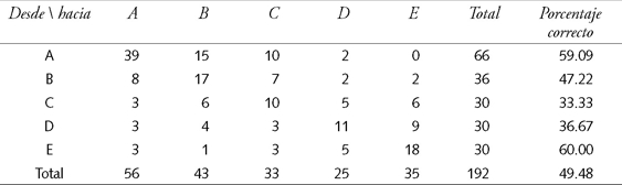 Es importante observar que si el modelo hiciera una predicción perfecta se obtendría una matriz donde todos los elementos se ubicarían en la diagonal, y en consecuencia el éxito sería de 100 por ciento. Si por el contrario no hay predicciones correctas, todos los elementos están fuera de la diagonal, y el éxito es cero. Un caso especialmente importante es cuando existe perfecta aleatoriedad en la asignación. Aquí el éxito no es 50 por ciento como se podría pensar, sino solamente 1/N, que en este caso ilustrativo es 1/3.