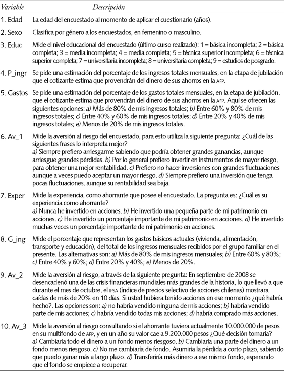 Se incluye la edad del cotizante, ya que ésta debe determinar en gran medida el horizonte de tiempo del ahorro (normalmente a mayor edad se tiende a ser más conservador). El sexo es una variable que también se considera importante, ya que pareciera que los hombres son más arriesgados que las mujeres (Mc Crimmon y Wehrung, 1990; Sjöberg, 2006). El nivel educacional que posee el cotizante también es una variable usualmente mencionada en los estudios de tolerancia al riesgo (Grable, 2000), ya que hay alguna evidencia de que quienes poseen un mejor nivel educacional toman posiciones más riesgosas, quizá por un mejor acceso a la información del sistema financiero.