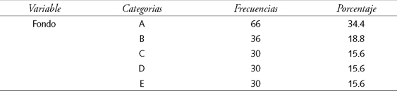 El cuadro 7 muestra que el porcentaje de clasificación correcta en el Modelo 1 es de 50 por ciento, y entonces se tiene un modelo con una buena capacidad predictiva comparado con el caso aleatorio, que arrojaría un éxito de sólo 20 por ciento en este caso. Esto puede compararse con el estudio de Cohn (1975), quien en un análisis similar reportó sólo 32.5 por ciento de clasificaciones correctas. Los resultados en detalle muestran que del total de 66 encuestados que declararon estar en el fondo A, sólo 39 de ellos resultaron bien clasificados de acuerdo con el modelo 1. De los restantes, el modelo predijo que 14 debieran estar en el fondo B, 11 en el fondo C y dos en el fondo D. Los resultados para cada fondo se interpretan de igual forma.