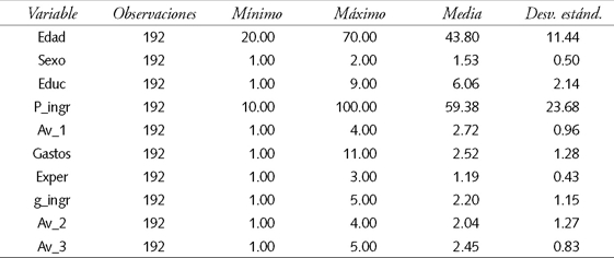 La literatura sugiere considerar variables como el género, la edad, estado marital, la ocupación, el tamaño de la familia, la educación y los ingresos (Cohn, 1975). Binswanger (1980) destaca la relevancia de las variables relacionadas con género, ingresos, edad y escolaridad para conocer las actitudes riesgosas. Con base en encuestas preliminares a una pequeña muestra de trabajadores, se verifica si la redacción de las preguntas es lo suficientemente clara, y se efectúan las correcciones necesarias. Con base en esto, se decidió incluir las diez preguntas que se muestran en el cuadro 3.