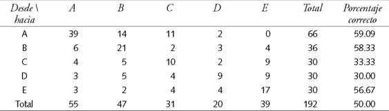 Finalmente, la medida de éxito en la clasificación global más usada en este tipo de análisis es la llamada matriz de confusión. Ésta muestra el porcentaje de observaciones que resultan bien clasificadas ex post, en comparación con las observaciones mal clasificadas. En algunos programas computacionales a veces se le llama también cuadro de contingencia. Ésta es una matriz cuadrada de dimensión k, es decir el número de clases o grupos. En el cuadro 2 se ilustra un ejemplo de N observaciones a clasificar en solamente k=3 grupos.