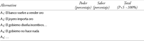 Factibilidad. Cuál es la mejor alternativa según dos dimensiones1 de elección: político (poder) y técnico (saber). Haga uso de la siguiente matriz —defina el porcentaje de ponderación para cada criterio y luego califique cada alternativa de uno a cinco, donde cinco es muy factible y uno es nada factible.