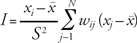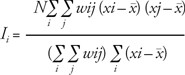 Donde: N es el total del número de áreas, wij es la medida de peso espacial de la contigüidad; xi y xj denota los valores observados para las áreas i y j respectivamente y x es el promedio de los valores de los atributos.