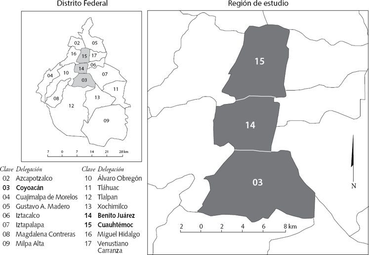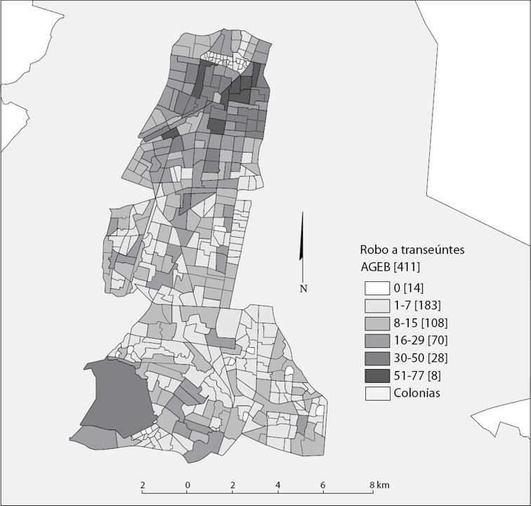 De acuerdo con los datos de que se dispone, este delito se presenta como el segundo con el mayor número de averiguaciones previas registradas en toda la entidad. La delegación que registró el mayor número de robos a transeúntes, y que fue la única que superó las tres mil denuncias, fue la Cuauhtémoc, con 3 004 casos. Por su parte, las delegaciones Coyoacán y Benito Juárez ocuparon los lugares siete y ocho con 1 034 y 933 casos respectivamente. Geográficamente, estas demarcaciones se ubican en el centro geográfico de la Ciudad de México (véase mapa 1). La delegación Cuauhtémoc tiene un uso de suelo habitacional, comercial y de servicios y en ella se localiza el Centro Histórico. Por su parte, las delegaciones Benito Juárez y Coyoacán también tienen usos de suelo mixtos.