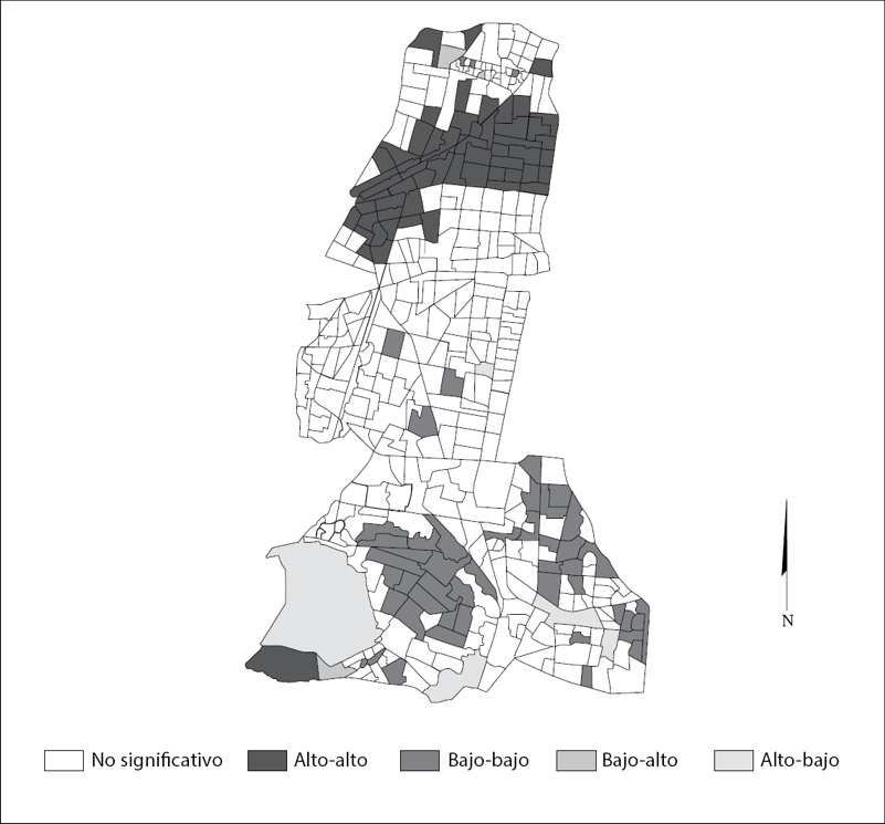 Los indicadores locales de asociación espacial sirven para demostrar estadísticamente si las variables presentan autocorrelación espacial o si los residuos se distribuyen aleatoriamente (Malczewski y Poetz, 2005). Dicha técnica permite de manera específica identificar la presencia de clústeres al considerar el valor que registran los valores vecinos y los compara por medio de pruebas de hipótesis para determinar sus grados de agrupamiento. A diferencia del I de Morán, estos agrupamientos sí se pueden representar en el espacio —o cualquier otra forma espacial— y se pueden visualizar los resultados en un mapa.