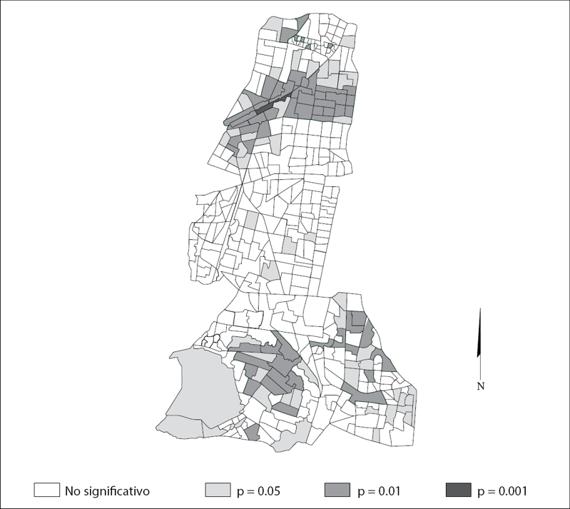 El índice I de Morán provee sólo una mirada parcial del fenómeno analizado, ya que el valor del clúster alto-alto refleja la contribución que realizan variables sociodemográficas a la de robo a transeúntes. En teoría, hay otras variables o dimensiones que influyen en la frecuencia de los robos a transeúntes, pero considerando exclusivamente la naturaleza espacial de los fenómenos se está ante la presencia de zonas con un efecto de “contagio espacial”. Es decir, ante la probabilidad de que zonas con altos valores de robos a transeúntes se ubiquen en la vecindad de zonas que también registran una gran cantidad de robos a transeúntes.