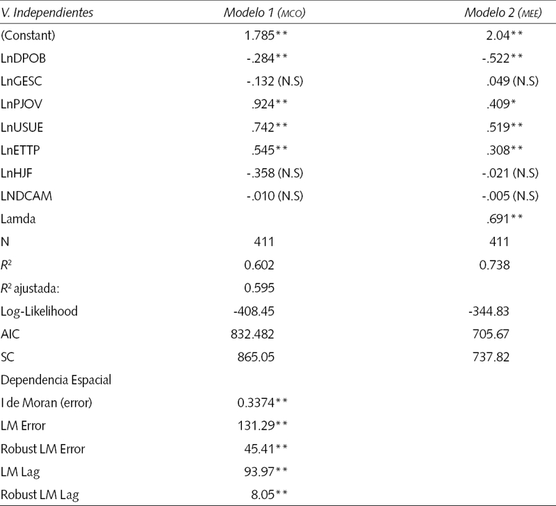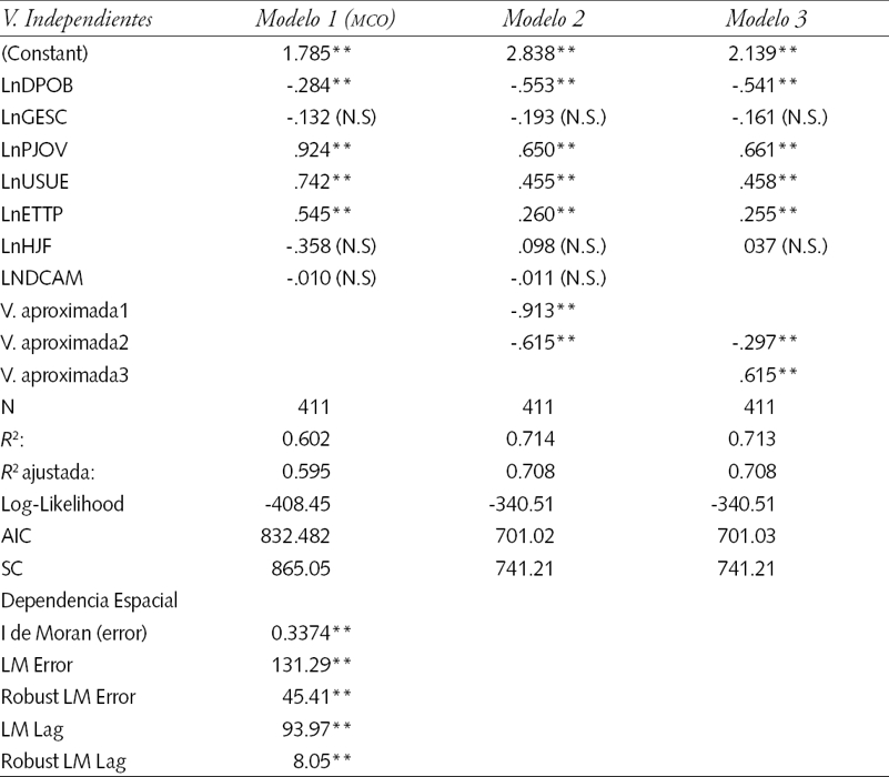 En el caso de que las medidas exploratorias revelaran la presencia de dependencia espacial se deberán implementar modelos multivariados de regresión espacial estimados con mínimos cuadrados ordinarios, si las pruebas de dependencia espacial muestran que persiste la autocorrelación se puede correr un modelo espacial del error (estimado con la técnica de máxima verosimilitud) o un modelo espacial retrasado (Sánchez-Peña, 2012).