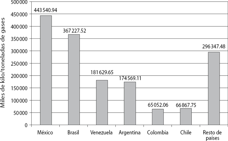 Pese a todos los esfuerzos, el caso de México dentro de América Latina respecto a la generación de gases nocivos para la atmosfera es, según el Banco Mundial (2011), uno de los más llamativos, ya que este país puede ser considerado como el mayor productor de emisiones de gases CO2 de esta región con un total de 443 540.94 kT; superando incluso a economías destacadas como Brasil con 367 227.52, Venezuela con 181 629.65, Argentina con 174 569.11, Colombia con 65 052.06 y Chile con 66 867.75 kT entre 2004 y 2010 (gráfica 1).