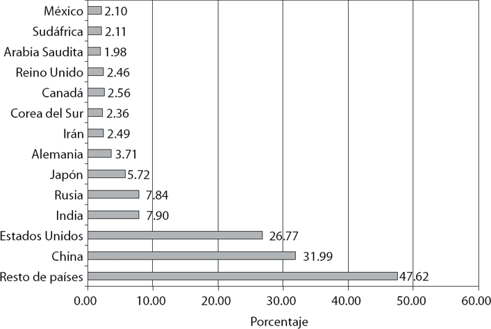 El caso de México es más que extraordinario (gráfica 2) ya que pese a estar considerado aún como una economía en vías de desarrollo, esto sin contar sus notables indicadores de producción, se encuentra entre los 13 países con mayor producción de gases CO2 en el mundo, detrás de países como China con 6 756 999.645; Estados Unidos con 5 655 029.475; India con 1 668 256.598; Rusia con 1 655 235.605 y Japón con 1 208 365.032 kT, además de otros países. La producción total del planeta equivale a 33 615 389.000 kT en promedio entre 2004 y 2010 (Banco Mundial, 2010a). Ésta es, por lo tanto, en muy buena medida, una de las razones por las cuales en las políticas públicas asociadas al tema medioambiental, aquellos gobiernos con mayores indicadores de producción y por supuesto con mayores niveles de emisión de gases de fecto invernadero suelen verse inclinados a participar en negociaciones sobre el cambio climático (Rong, 2010).