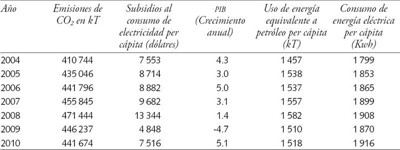 En este sentido se puede afirmar que las actuaciones antropogénicas orientadas al crecimiento económico se traducen en un deterioro del ambiente. Sin embargo, el problema que en este trabajo se trata es el de los subsidios al sector energético; que parece presentar una relación directa entre la dimensión económica y la ambiental, ya que la economía no crece y el ambiente se deteriora. Esto debido a que los subsidios representan una carga para el Estado, pues lo negativo no es el egreso que éste representa, sino el costo de oportunidad que lleva implícito, lo que se traduce en recursos que el Estado está dejando de usar en otras alternativas que pueden ser más eficientes. Además, el agravante mayor está vinculado al hecho de que el sector energético que recibe la subvención es aquel que genera energía a partir de combustibles fósiles, lo que puede traducirse en un mayor impacto en las concentraciones de CO2 emitidas por este país.
