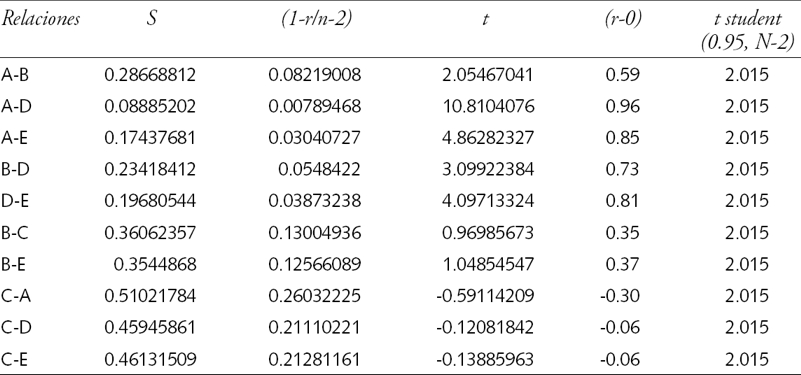Para validar esta hipótesis se debe analizar la relación A-E. Al respecto, el cuadro 4 presenta los resultados de la correlación de estas dos variables. Puede notarse que toma un valor de 0.85, lo cual indica una alta correlación. Al igual que con los demás resultados, éste debe ser sometido a una prueba de significancia, cuyo valor se presenta en el cuadro 4. En ella se aprecia que el valor t es de 4.86 y éste es mayor que el valor de la prueba t de student, por lo que se considera que estas variables se encuentran relacionadas de una forma significativa.
