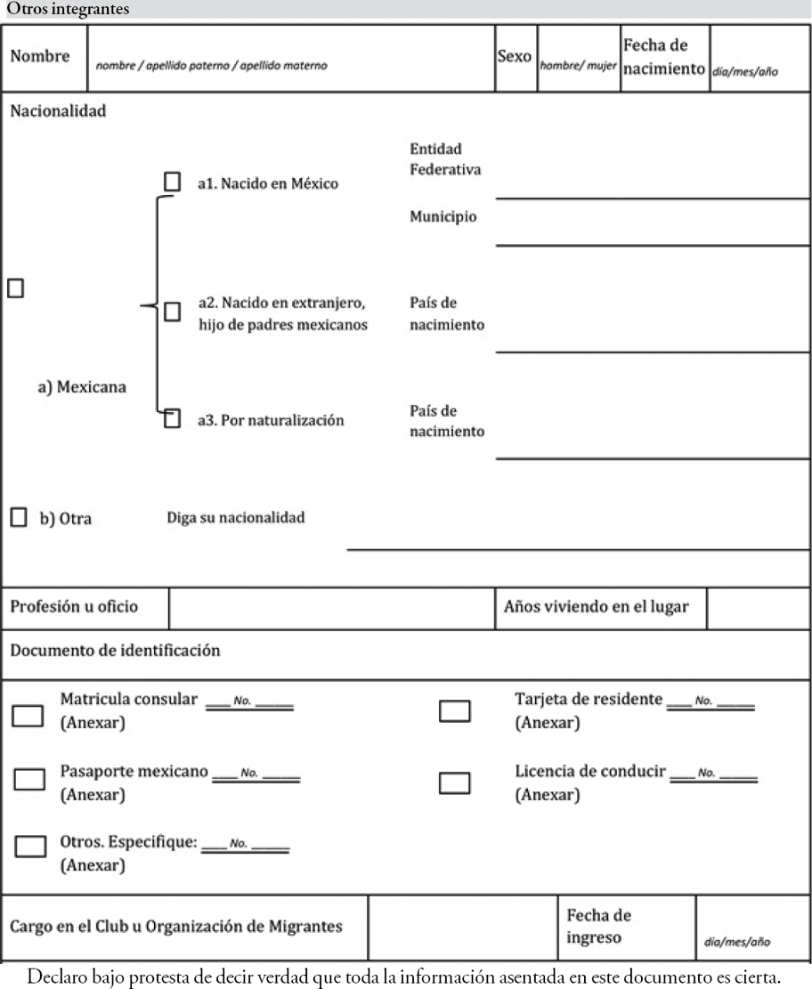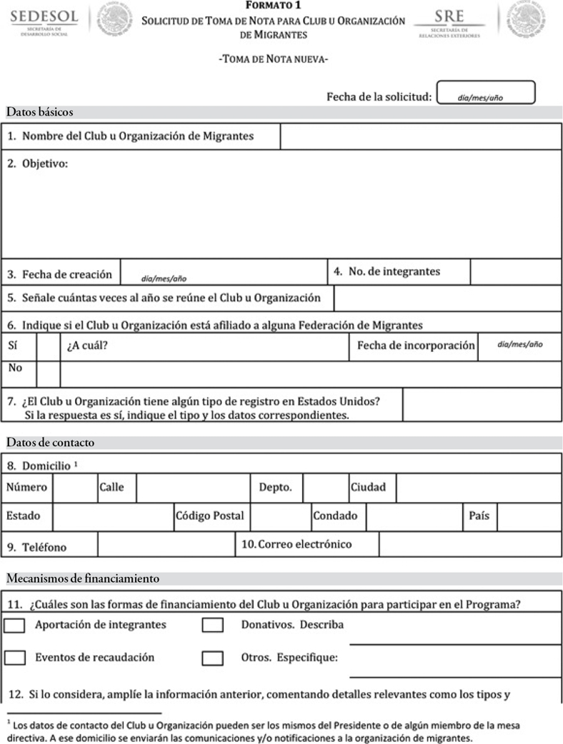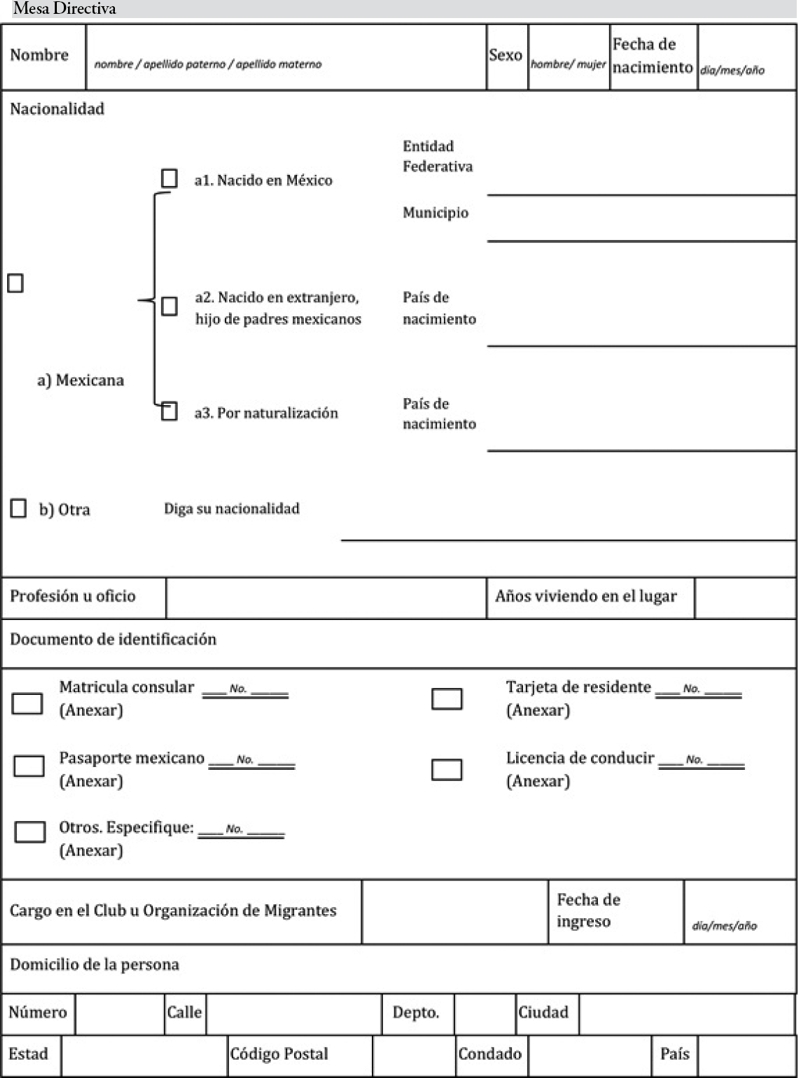 Por otra parte, casi de manera simultánea fuimos a inscribir el club en el consulado mexicano de Los Ángeles. Hugo nos comentó que el gobierno en México había emprendido una serie de medidas para apoyar a los migrantes mexicanos en Estados Unidos. De las distintas medidas que nos platicó, el programa 3x1 inmediatamente capturó nuestra atención (Anexo 3). Este programa tiene la particularidad de promover acciones que benefician directamente a las comunidades de las cuales son originarios los migrantes, objetivo que calza como anillo al dedo con los objetivos de nuestro club. La inscripción ante el consulado fue muy sencilla ya que éste sólo pide que se llene la solicitud de toma de nota para reconocer la existencia legal de cualquier club (Anexo 5). En este documento hay que especificar los nombres de los integrantes de la mesa directiva, los objetivos de la organización, las formas de financiamiento, el número de veces que el club se reúne al año. Además piden a cada club que demuestre que cuenta con una membresía de al menos diez personas de origen mexicano. En nuestro caso, tomando en cuenta todos los trámites emprendidos previamente, no tuvimos ningún problema para reunir los requisitos que nos solicitaban, y me siento muy orgulloso en subrayar que nuestra membresía —la cual fluctúa entre 50 y 60 miembros activos al año— no sólo sobrepasa con mucho el piso mínimo pedido por la autoridad mexicana, sino que ha permanecido relativamente estable a lo largo de más de cuarenta años.