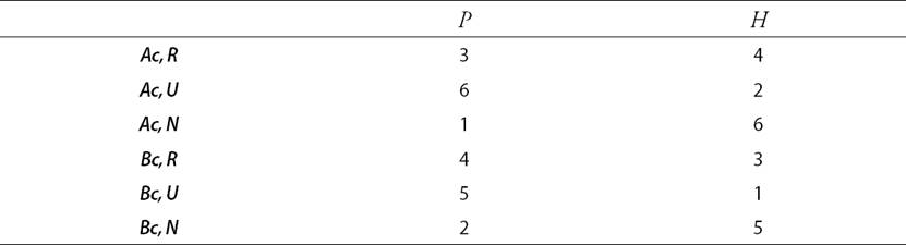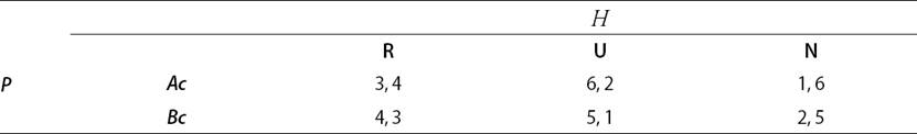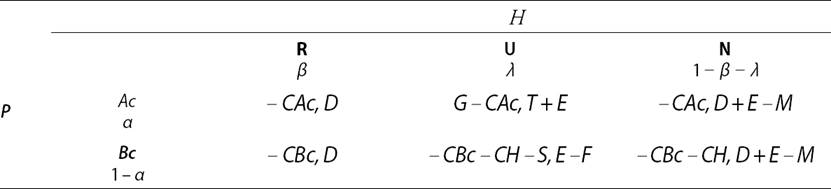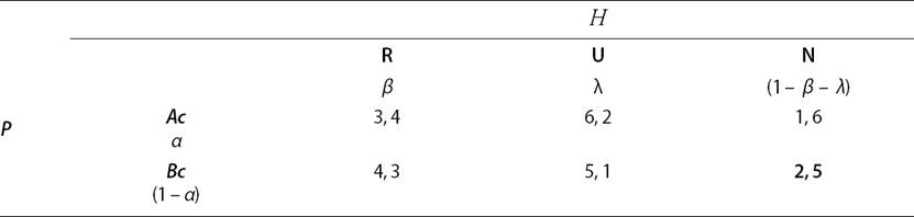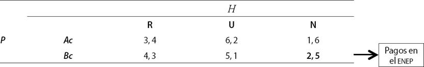 Donde Ac quiere decir producir información de SyE de alta calidad y Bc significa producir información de SyE de baja calidad. Asimismo, R significa no solicitar información de SyE a P, U significa solicitar y usar la información de SyE, y N significa solicitar pero No usar la información de SyE.