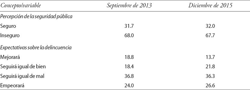 Las anteriores afirmaciones son corroboradas para el caso mexicano por los resultados de la Encuesta Nacional de Seguridad Urbana que apuntalan la importancia del problema. La información del Cuadro 1 señala que la percepción de la inseguridad pública no ha mejorado de septiembre de 2013 a diciembre de 2015. El porcentaje de ciudadanos que se siente inseguro en la ciudad que habita, se mantuvo prácticamente estable entre 68.0 y 67.7 por ciento. Más negativo es el resultado que se refiere a las “Expectativas sobre la delincuencia”, ya que en diciembre de 2015, 62.9 por ciento de los ciudadanos pensaban que la inseguridad “Seguirá igual de mal o empeorará”, comparado con 60.8 por ciento que hicieron este señalamiento en septiembre de 2013.