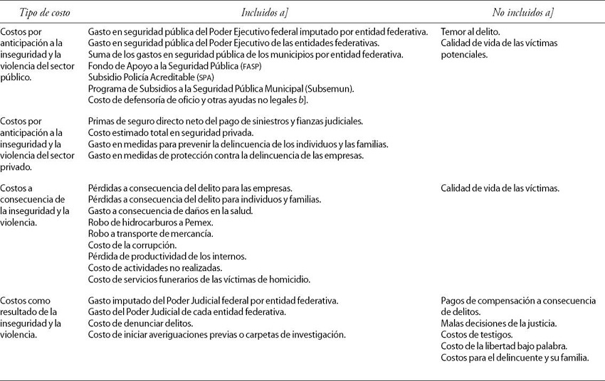 Otros conceptos que requieren aclaración son las pérdidas a consecuencia del delito para las empresas, los individuos y las familias, el robo de hidrocarburos a Pemex y el robo a transportes de mercancía, entre otros, pues podrían considerarse como transferencias y, por ende, como un cambio de propiedad sin costo social. Sin embargo, dado que los delitos patrimoniales son transferencias ilegales e involuntarias de las víctimas a los delincuentes, se considera una pérdida para la sociedad y por lo tanto se trata como un costo de oportunidad originado por la acción de la delincuencia (Brand y Price, 2000: 18). Una vez realizadas las anteriores precisiones, se presentan los resultados del ejercicio.