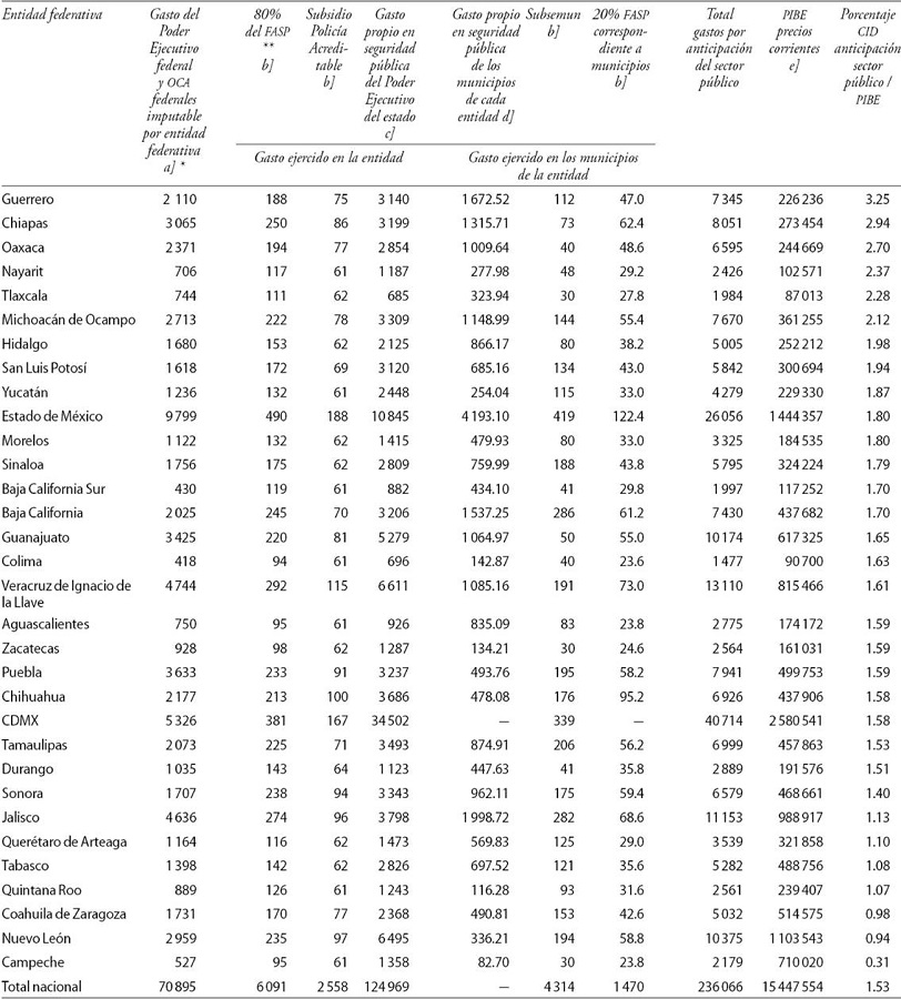 Existen gastos de seguridad pública realizados por el Poder Ejecutivo federal en los cuales la cuenta pública federal no permite distinguir el gasto ejercido en cada entidad federativa. Lo mismo ocurre con algunos organismos constitucionales autónomos, como la Comisión Nacional de Derechos Humanos. Dado que el presente trabajo compara el CID por entidad federativa, el gasto federal señalado se imputa a cada una de éstas en función del porcentaje de población de las mismas en el total de la población nacional. Por otro lado, existen otros programas, como el Fondo de Apoyo a la Seguridad Pública (FASP) en el cual 80 por ciento de la asignación es para el estado y el restante 20 por ciento se distribuye entre sus municipios. En otros programas, como el Subsidio para la Policía Acreditable y el Subsemun cien por ciento del apoyo va para las entidades o los municipios respectivamente. Finalmente, los estados y los municipios asignan a la seguridad pública parte de sus propios recursos. La suma de estos desembolsos constituye el gasto por anticipación del sector público (GAT).